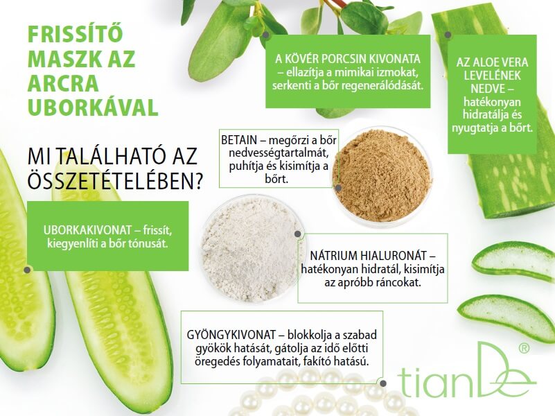 Egy ilyen pakolás alkalmazása után a bőr észrevehetően felfrissül és fiatalabbnak néz ki. No de mennyi hercehurcával járnak az ilyen „kiskerti” maszkok! Az uborkaszeletek elcsúszkálnak, igyekeznek mindenütt ott lenni, csak éppen nem az arcon. A TianDe felkínálja a lehetőséget, hogy élvezhessétek az uborkamaszk minden előnyét, annak mindenféle hátránya nélkül! A maszk szupervékony textúrája szorosan felfekszik a bőrre és a lehető legtöbb hasznos hatóanyagot átadja annak.