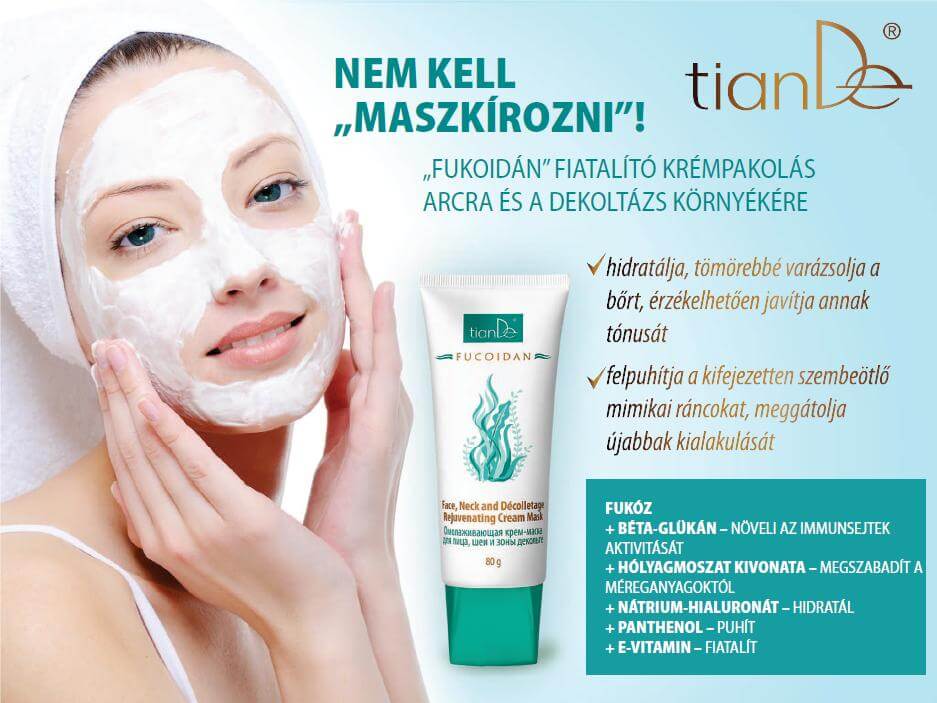 Tapasztalja meg saját bőrén az „élő” algák erejét! A TianDe által kínált Fukoidán termékcsalád több olyan kozmetikumot is felsorakoztat, amelyek teljes körűen ápolják és gondozzák a bőrt. Ezek olyan szerek, mint a lemosó és tisztító tej a dekoltázsra, a tisztító arclemosó, az öregedésgátló regeneráló arckrém, a ránctalanító gél-koncentrátum a szemkörnyékre, a fiatalító krémpakolás arcra és a dekoltázs környékére, a CC krém és az ajakpuhító balzsam.
