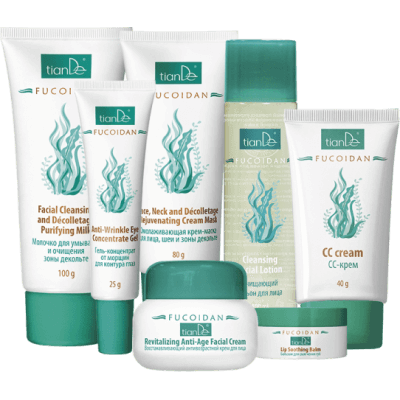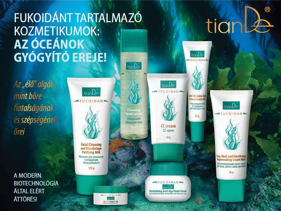 Tapasztalja meg saját bőrén az „élő” algák erejét! A TianDe által kínált Fukoidán termékcsalád több olyan kozmetikumot is felsorakoztat, amelyek teljes körűen ápolják és gondozzák a bőrt. Ezek olyan szerek, mint a lemosó és tisztító tej a dekoltázsra, a tisztító arclemosó, az öregedésgátló regeneráló arckrém, a ránctalanító gél-koncentrátum a szemkörnyékre, a fiatalító krémpakolás arcra és a dekoltázs környékére, a CC krém és az ajakpuhító balzsam.