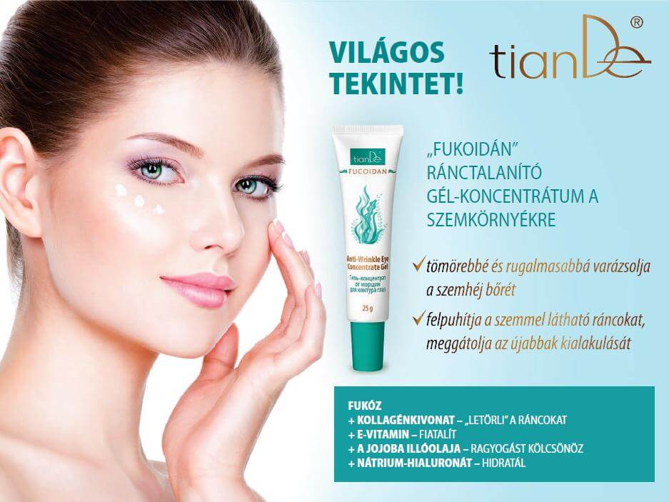 A szemhéj bőrét eleve veszélyezteti a ráncok korai kialakulása, ezért állandó ápolást igényel. A TianDe „Fukoidán” termékcsaládjába tartozó Ránctalanító gél-koncentrátum a szemkörnyékre segít meghosszabbítani a szemhéjkörnyéki bőr fiatalosságát. Dús összetételének köszönhetően a gél-koncentrátum képes helyreállítani a szemhéjak zsenge bőrének tömörségét, eltüntetni az apróbb ráncokat, illetve meggátolni újabbak kialakulását.